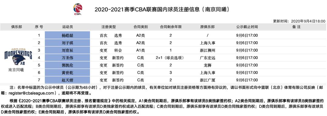 9月4日,南京同曦与球员杨皓喆、刘子琪、刘育辰、万圣伟、郭凯伦、黄世乾和赵天熠完成签约
