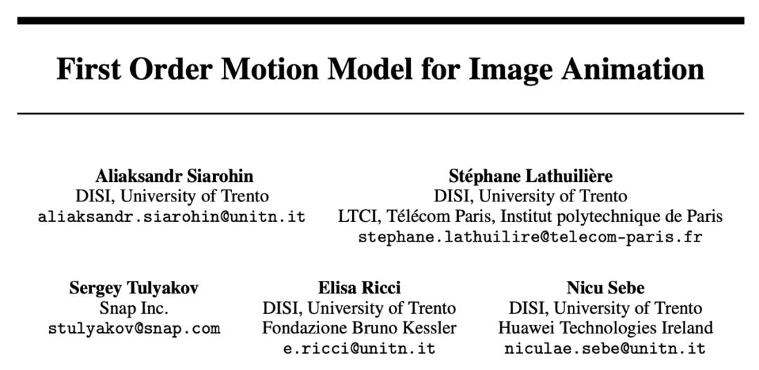 First order motion 模型来自顶会 NeurlPS 2019 上的一篇论文,《First Order Motion Model for Image Animation》(《用于图像动画的一阶运动模型》),作者来自意大利的特伦托大学以及 snap 公司。
