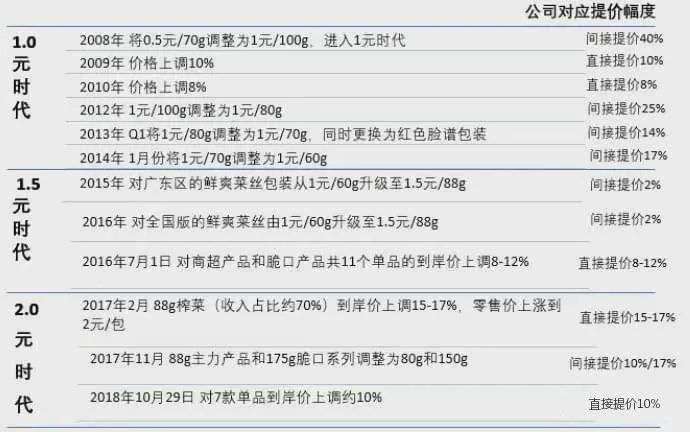 2008年,涪陵榨菜集团首次提价,原价0.5元/70g的袋装榨菜,变成了1元/100g,上调幅度达到40%。