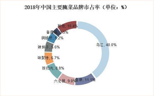 华经情报网数据显示,2018年,涪陵乌江榨菜品牌就稳坐腌菜行业第一的位置,市场占有率达到40%,渠道终端覆盖了全国市场。排名第二的鱼泉榨菜,占比不过11.1%,仅以成都和北京市场为主。