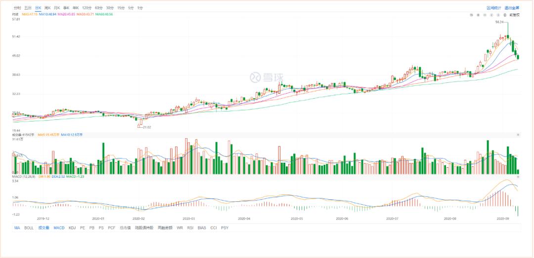 9月初,食品板持续拉升,有“榨菜第一股”之称的涪陵榨菜股价达到55.46元/股,上涨7.34%,市值接近440亿。