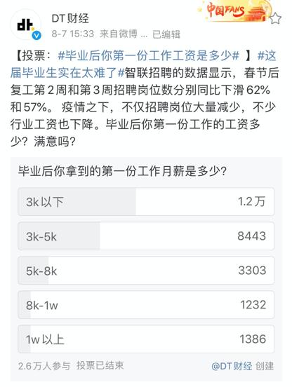 (图片为DT财经发起的微博调研“毕业后你的第一份工作工资是多少”)