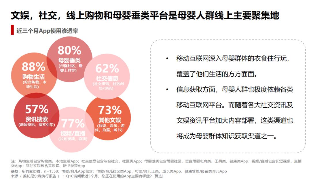 成为妈妈之前,母婴群体首先也是热爱生活、追求泛娱乐的女性群体,追剧、看综艺等线上娱乐行为自然必不可少。此外,在学习“为人母”的场景中,母婴垂直APP凭借专业的内容知识、更聚焦于母婴阶段的用户圈层,自然成为母婴群体及潜在母婴群体的流量集散地。