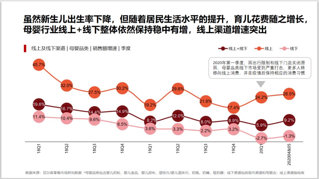 近日,全球著名市场调研机构尼尔森一份名为《2020母婴消费洞察》的最新研报就显示:2020年Q1季度,母婴人群转移向线上消费,线上渠道销售额增速达24.2%;母婴线上渠道销售额增速于2020年4月和5月同比去年同期平均达26.5%,远超行业9.2%的整体增速。