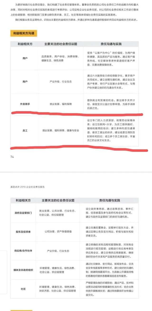 此外,今年5月,美团发布了《2019年度企业社会责任报告》(下称"报告"),该报告指出了没有签订任何劳动合同的"外卖骑手"是不属于"员工"这一栏的。较之"员工","外卖骑手"少了"健康与安全"的相关社会责任议题。