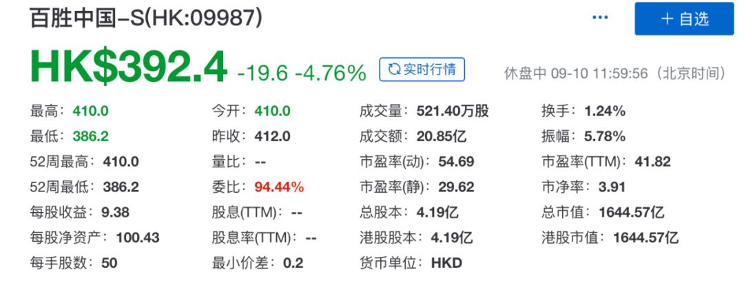 不同于农夫山泉的火爆,上市首日,百胜中国开盘即震荡下行,宣告破发,且一度跌逾5%,截至上午休盘,股价报392.4港元/股,跌4.76%,市值1644.57亿港元。