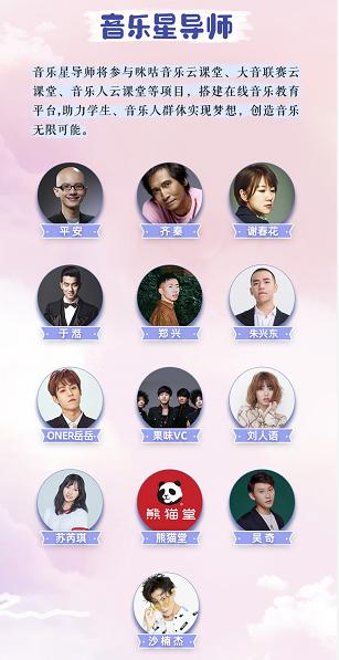 咪咕音乐相关负责人介绍,咪咕音乐云上学院拥有强大的导师阵容:不仅有平安、齐秦、谢春花、于湉、郑兴、朱兴东、ONER岳岳、果味VC、刘人语、赵泳鑫、那吾克热-NW、苟瀚中等 “音乐星导师”,还将邀请到中音协副主席徐沛东、国家一级作曲作词家魏德泮等大师级导师在线授课。以5G超高清直播技术加持,以内容为王,咪咕音乐云上学院策划打造了咪咕音乐课堂、咪咕星主播、音乐大师课、非凡音乐计划和音乐教育等多个内容板块,包括专注于儿童音乐教育的公益、亲子课程,也有针对音乐专业学子引入的知识课程,还有面向广大音乐爱好者、音乐人的在线直播课。
