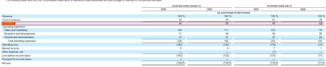 根据招股书披露的财报显示,2020财年,Snowflake的营收为2.65亿美元,同比增长174%;截至今年7月末,其营收达到2.42亿美元,同比增长133%,预计全年营收或将超5亿美元;同时,Snowflake净亏损有所收窄,今年1月底,公司净亏损达到3.485亿美元,截止到今年7月末,净亏损降至1.772亿美元;且截止到今年7月末,毛利率由去年1月的46.5%升至61.6%。