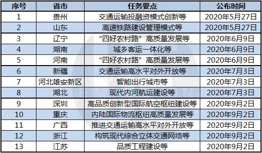 在随后召开的全国两会期间,贵州和山东两地的交通强国建设试点方案率先公布;此后两个月,交通运输部先后公布了辽宁、湖南、河南,以及新疆、河北雄安新区、湖北建设方案的批复意见;而在本月初,剩下5家试点方案的批复同时放出。