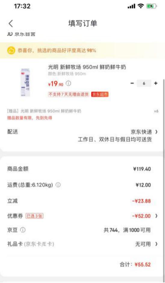 最开始,是光明旗下的新鲜牧场鲜牛奶(950毫升)在京东上来了个“买一赠一”的活动,下单6瓶到手12瓶,实际付款55.52元,平均到每一瓶的价格是4.63元。简单计算一下,一毫升鲜奶的价格约为0.00487元。