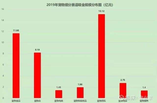 宠物医疗在我国还是一片蓝海,据宠业家的数据显示,2019年宠物医疗领域共完成了4笔融资,融资总额达到了15.12亿元,力压宠物食品、用户、电商等行业。