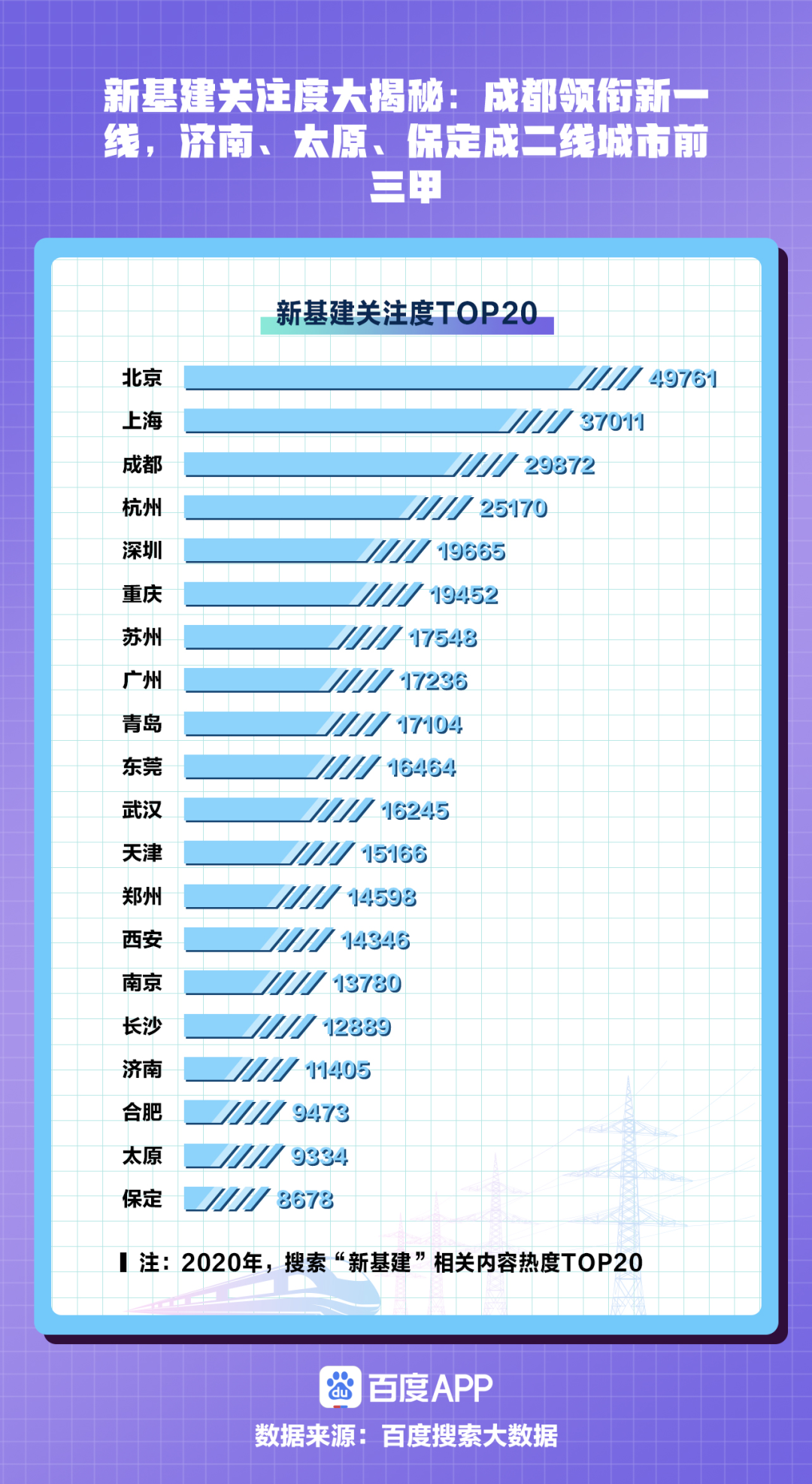 在国家大力发展的新基建领域,一线城市及新一线城市占据了“新基建”关注度Top20的大部分名额。百度搜索大数据显示,北京以绝对优势位列第一,二线城市同样不甘示弱,济南、太原、保定成功上榜。