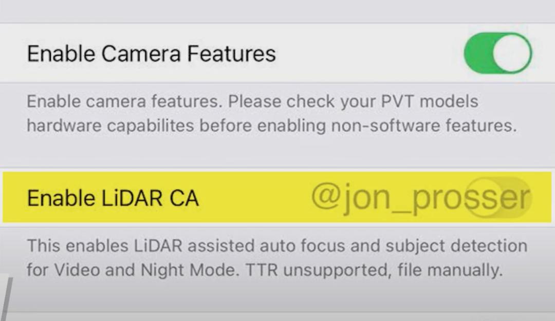 同样是来自 Jon Prosser 的一张相机设置截图显示, iPhone 12 Pro Max 还会搭载激光雷达,这颗索尼制造的激光雷达在新款 iPad Pro 上已经出现,可以提升相机的自动对焦能力。