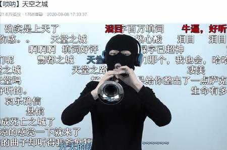 比如下面这位头戴脸基尼的"悍匪"UP主@浑元Rysn,用阴间乐器唢呐,弹奏原本该恬逸温馨的《天空之城》,就足以概括了唢呐这门乐器的全部奥义。