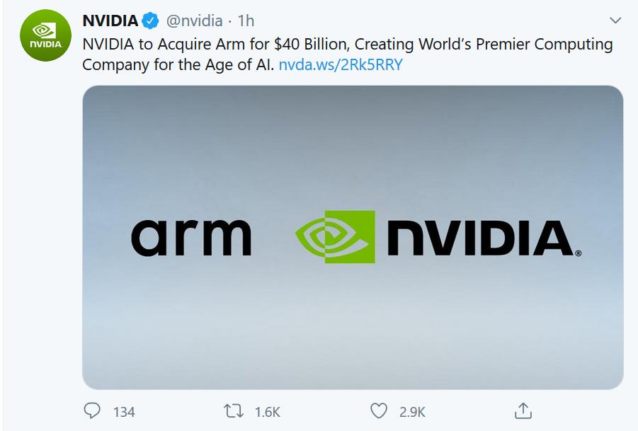 科技界发生了一件大事儿并迅速的登上了各主流媒体的科技头条。美国著名的图形处理芯片(GPU)公司Nvidia宣布以400亿美金的估值收购世界上著名的芯片技术公司Arm。