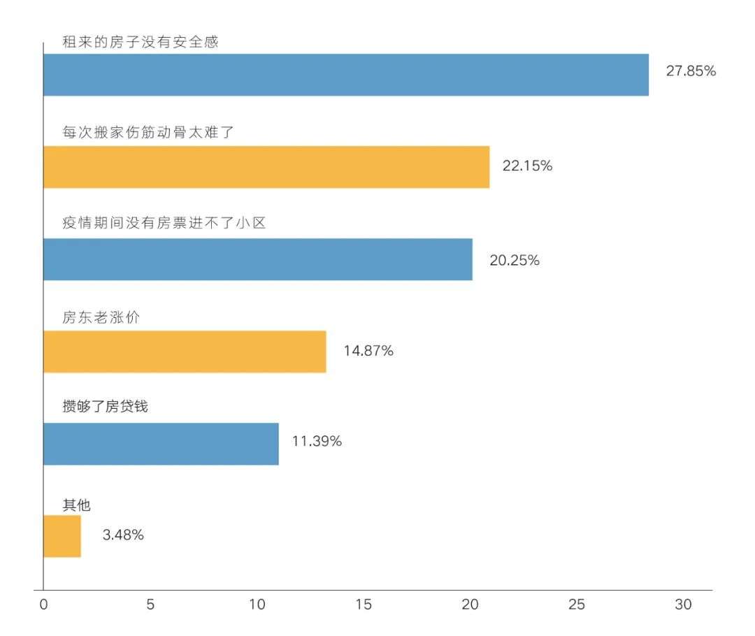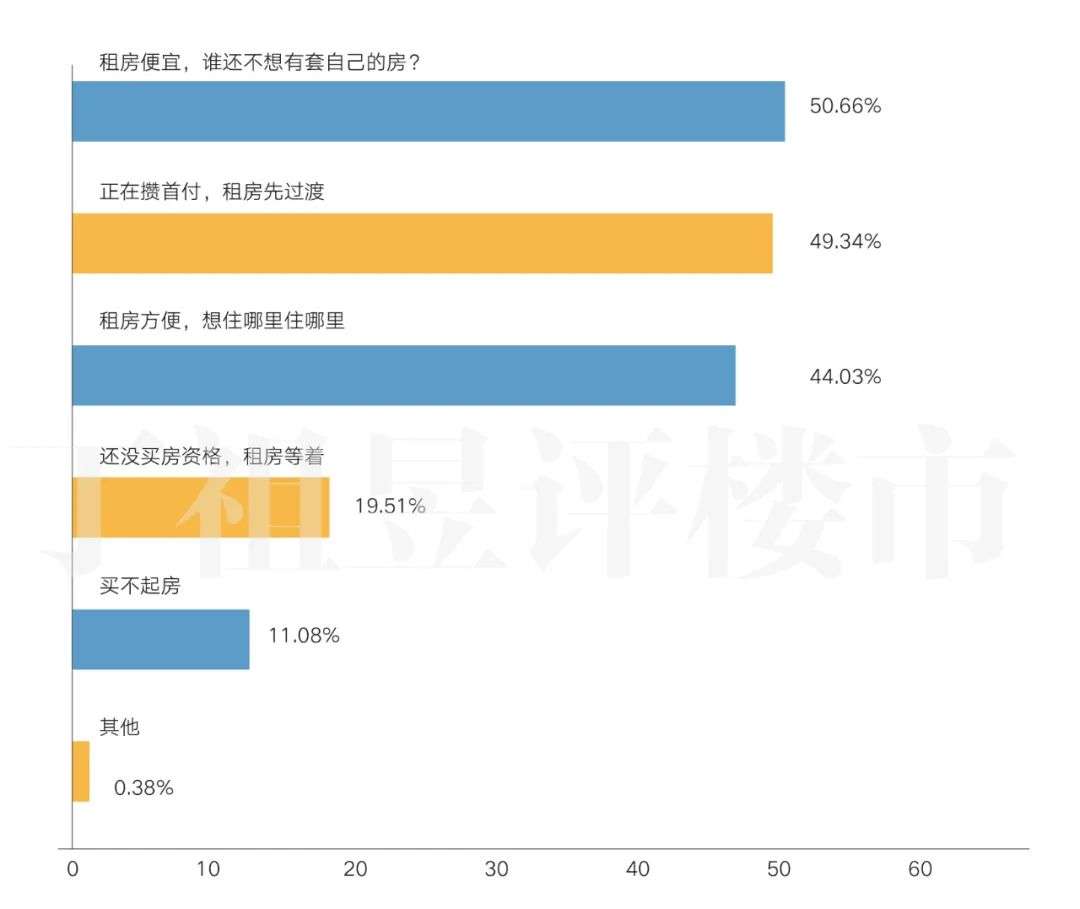 这一选项明显反映出了受访家庭中两种完全不同的状态,对于无房家庭来说,租房只是暂时的,他们还是要买房。而对于有房家庭来说,租房的原因主要是因为已有房租居住条件不理想,由于这一问题短期内无法解决,因此继续租房成为了他们的选择。