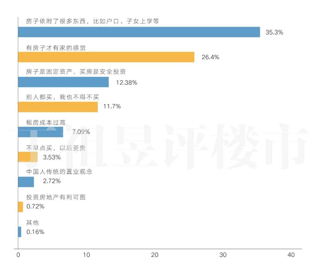 在选择买房的理由中“房子依附了很多东西,比如户口、子女上学等”、“有房子才有家的感觉”两项成为了所有家庭最多的选择。