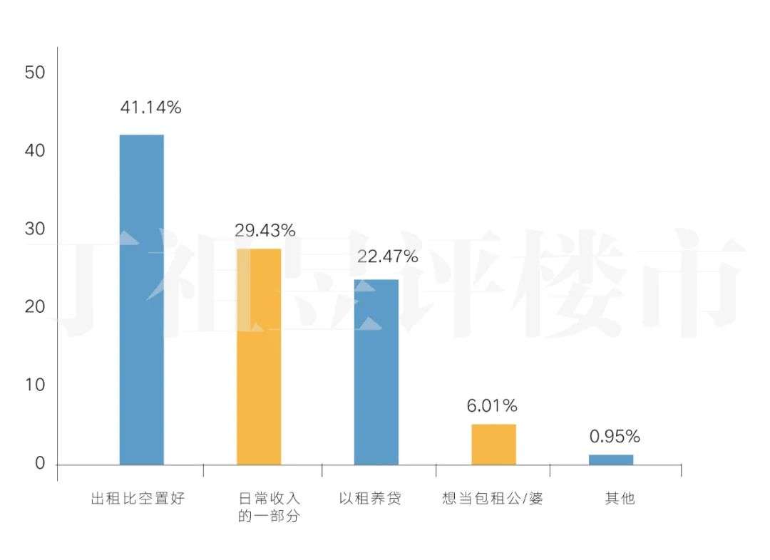对于有房在出租的房东来说,房屋出租的理由有点佛,41.14%受访家庭认为出租比空置好,29.43%认为只是日常收入的一部分,也有22.47%受访家庭表示可以以租养贷,想当包租公/婆的仅占6.01%。