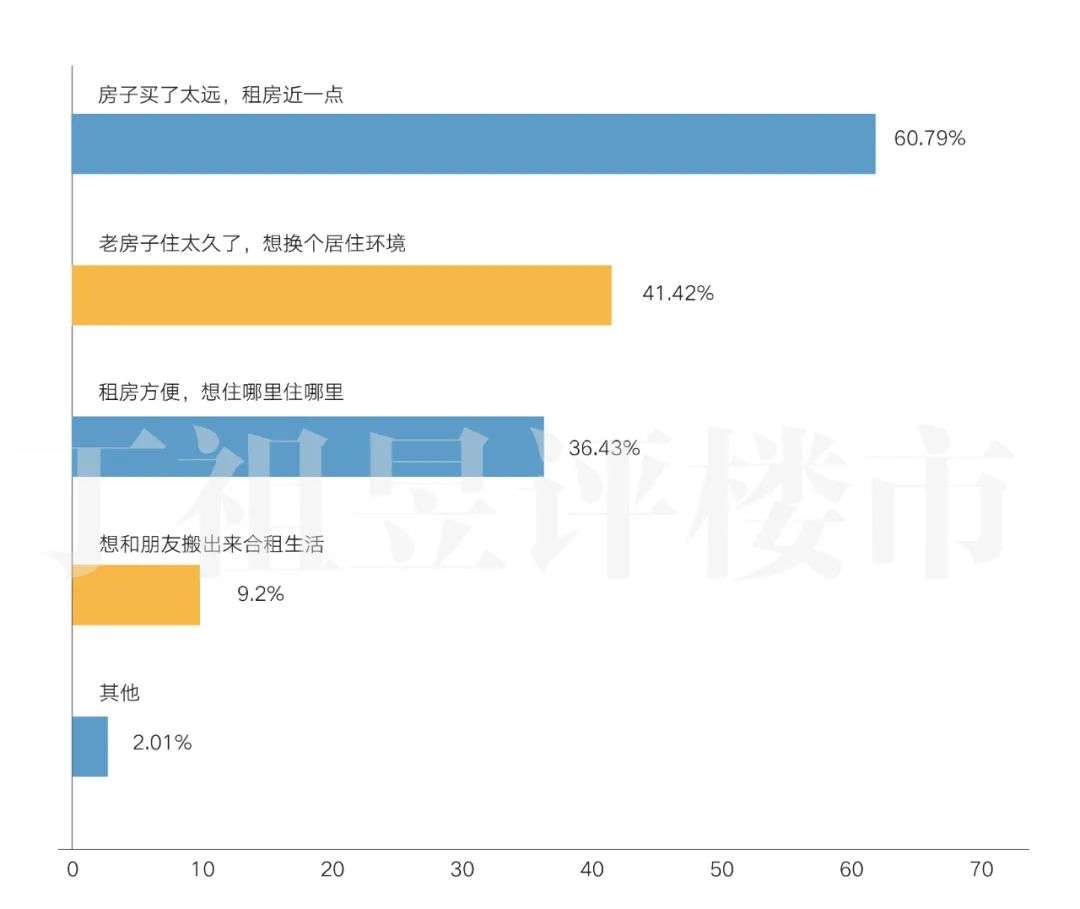 对于租房已买房受访家庭来说自身房子的居住情况不理想是其主要租房原因,其中,“房子买了太远,租房近一点”一项选择最多占60.79%,其次是“老房子住太久 想换个居住环境”,约占41.42%。