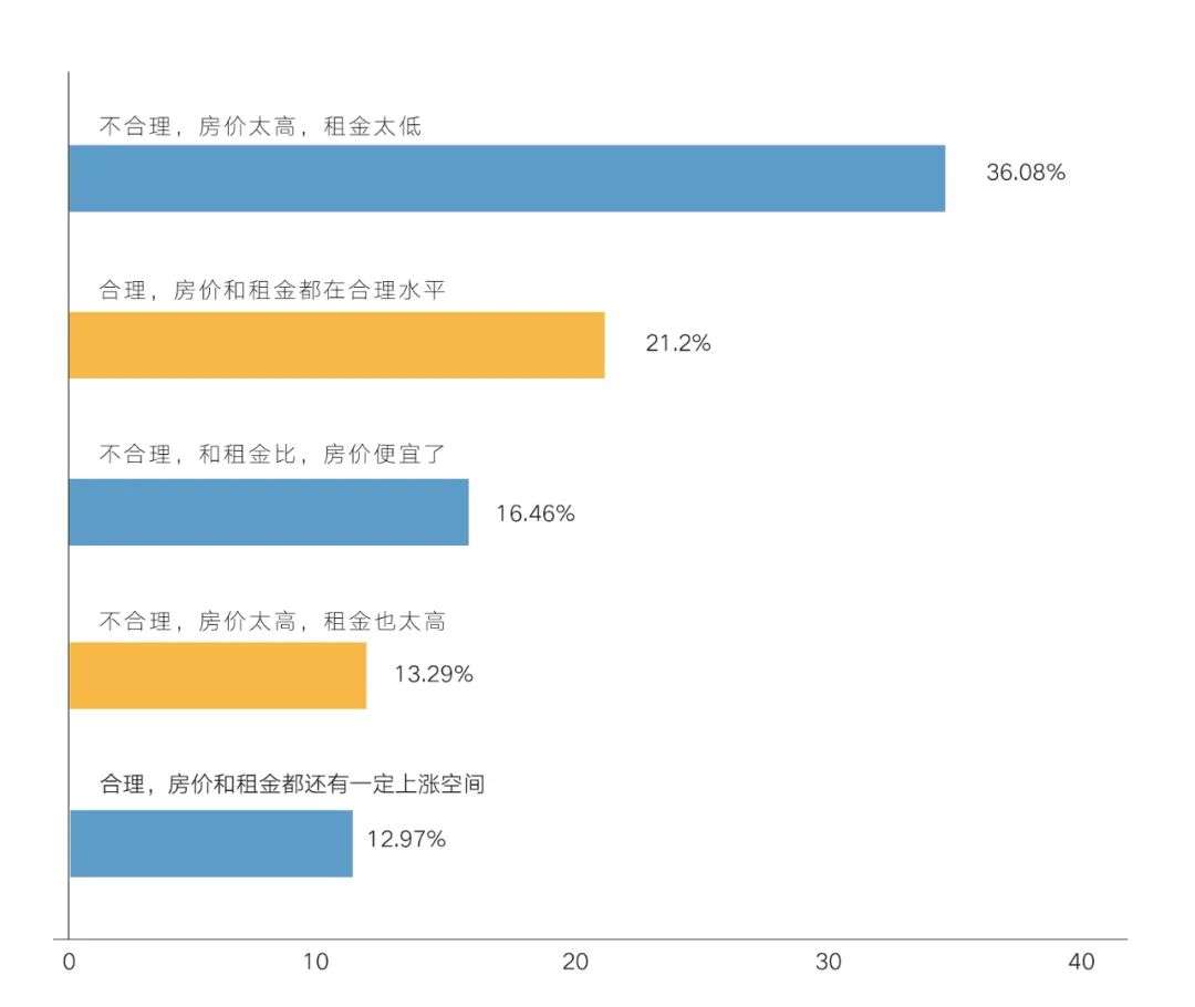 在房子价格和租金对比是否合理一项中,36.08%受访家庭认为不合理,房价太高租金太低。