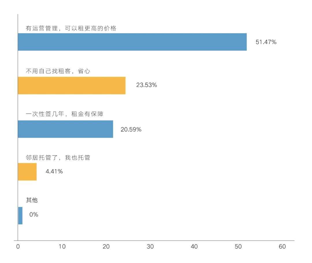 在选择个人出租还是找运营商托管选项中,受近期长租公寓暴雷影响,43.35%受访家庭表示会找中介出租,33.86%选择个人出租,愿意继续选择托管给长租公寓运营商的仅占21.52%受访家庭,他们选择托管的理由是,超半数认为可以租到更高的价格。