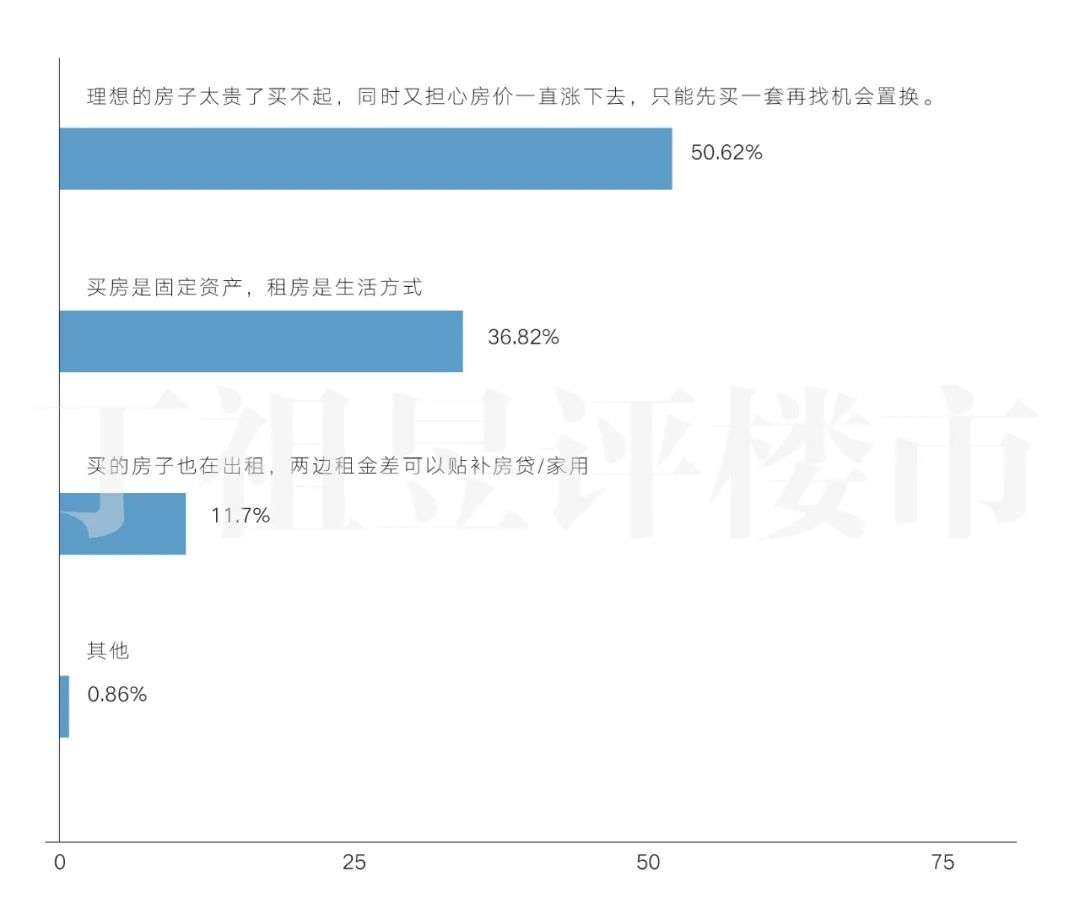 在有房还选择一直租房的受访家庭中有50.62%认为,理想的房子太贵了买不起,同时又担心房价一直涨下去,所以只能先买一套再找机会置换,另有11.7%家庭表示买的房子也在出租,两边的租金差可以贴补房贷/家用。