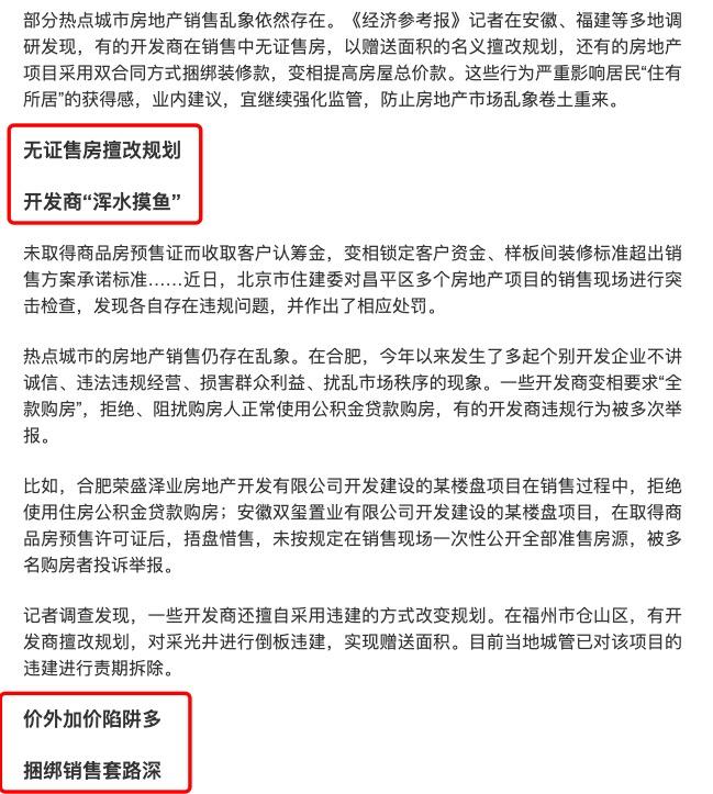 比如说,有些城市出现的无证售房、捆绑装修包、擅改规划……