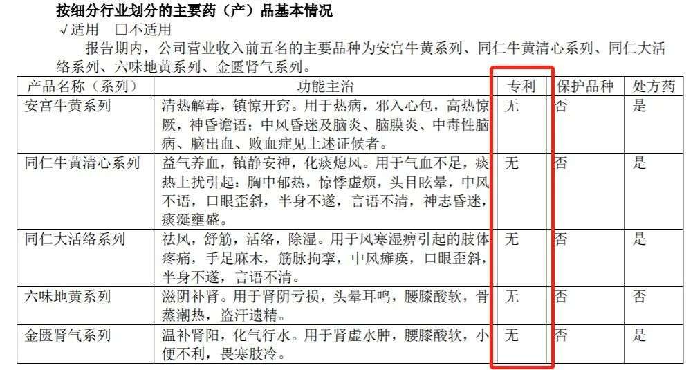 很难想象,在北京同仁堂集团成立至今的二十余年中,其主力产品仍然是已有几十年历史的安宫牛黄系列、同仁牛黄清心系列、同仁大活络系列、六味地黄系列、金匮肾气系列。不仅如此,这些产品甚至没有任何一项专利。