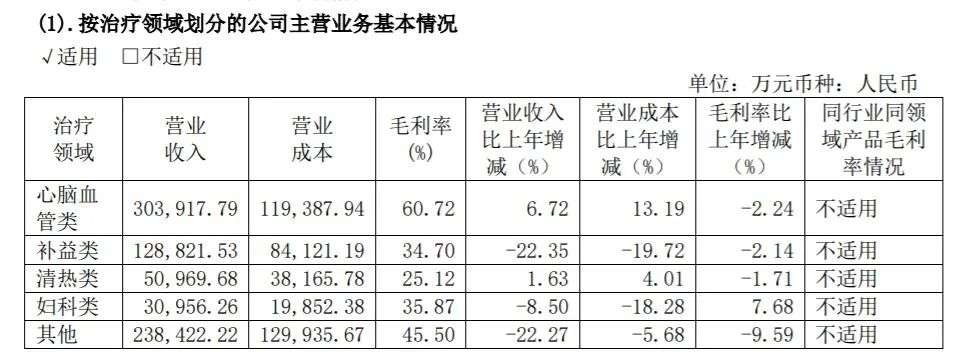 2019年,补益类、妇科类产品、其他类的销售额分别为12.88亿元、3.1亿元、23.84亿元,同比分别减少22.35%、8.5%、22.27%。与此同时,补益类、其他类产品的毛利率也有所下滑,分别比2018年同期减少2.14%以及9.59%。