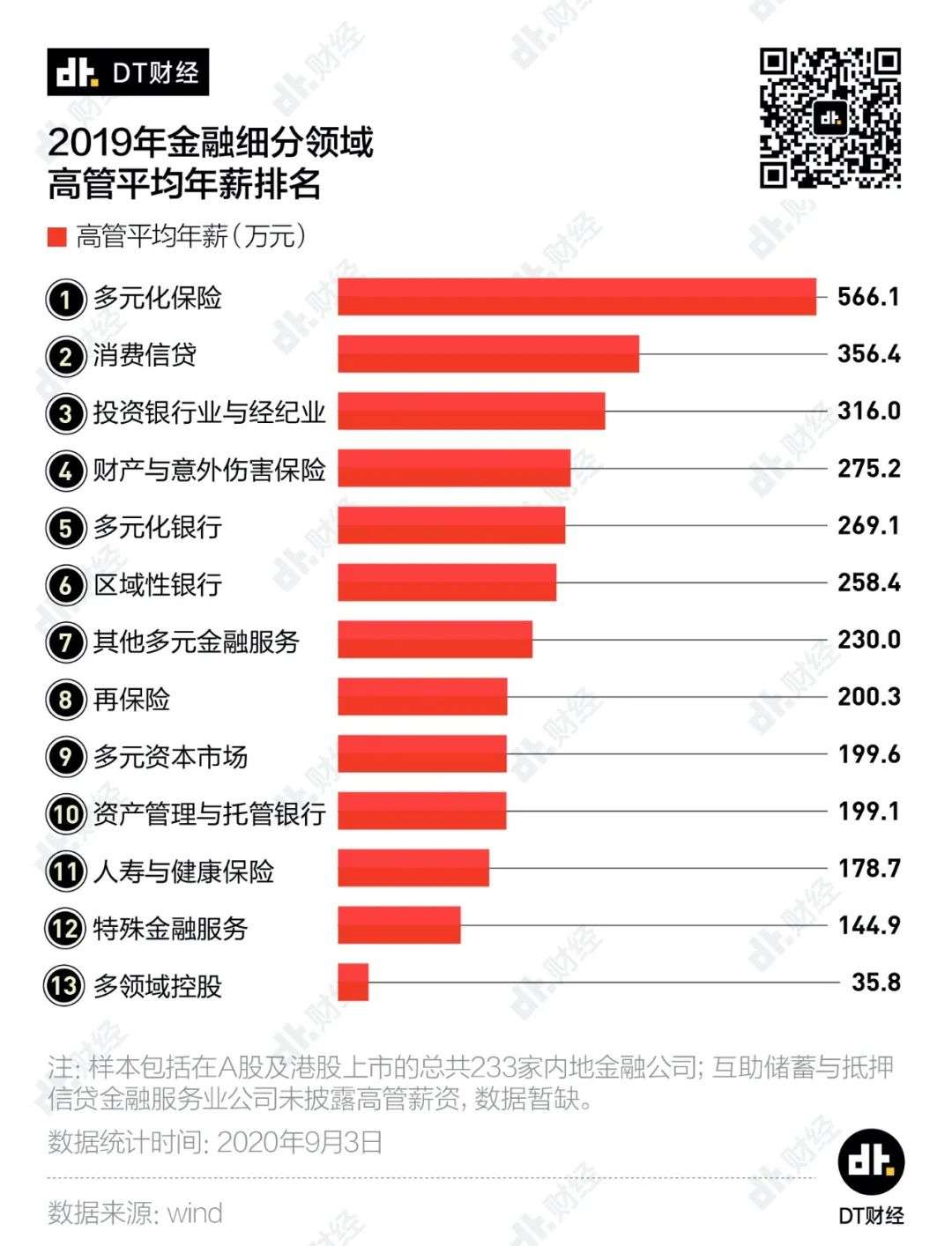 仅从薪资来看,多元化保险的高管以566万的高薪遥遥领先,比第二名的消费信贷整整高出了210万。此外,排名第三的投资银行业与经纪业高管平均薪资也超过了300万。