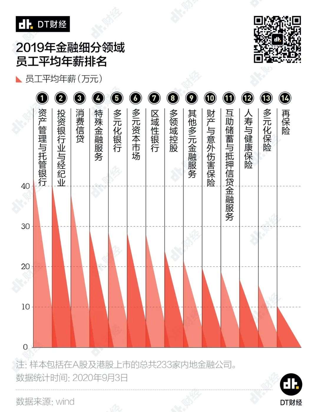 DT君统计了在A股及港股上市总共233家内地金融公司的2019年报,找出了金融领域各个细分行业高管的平均薪资(此处薪资不包括分红等额外收入,可能会比高管实际收入要低,后同)。