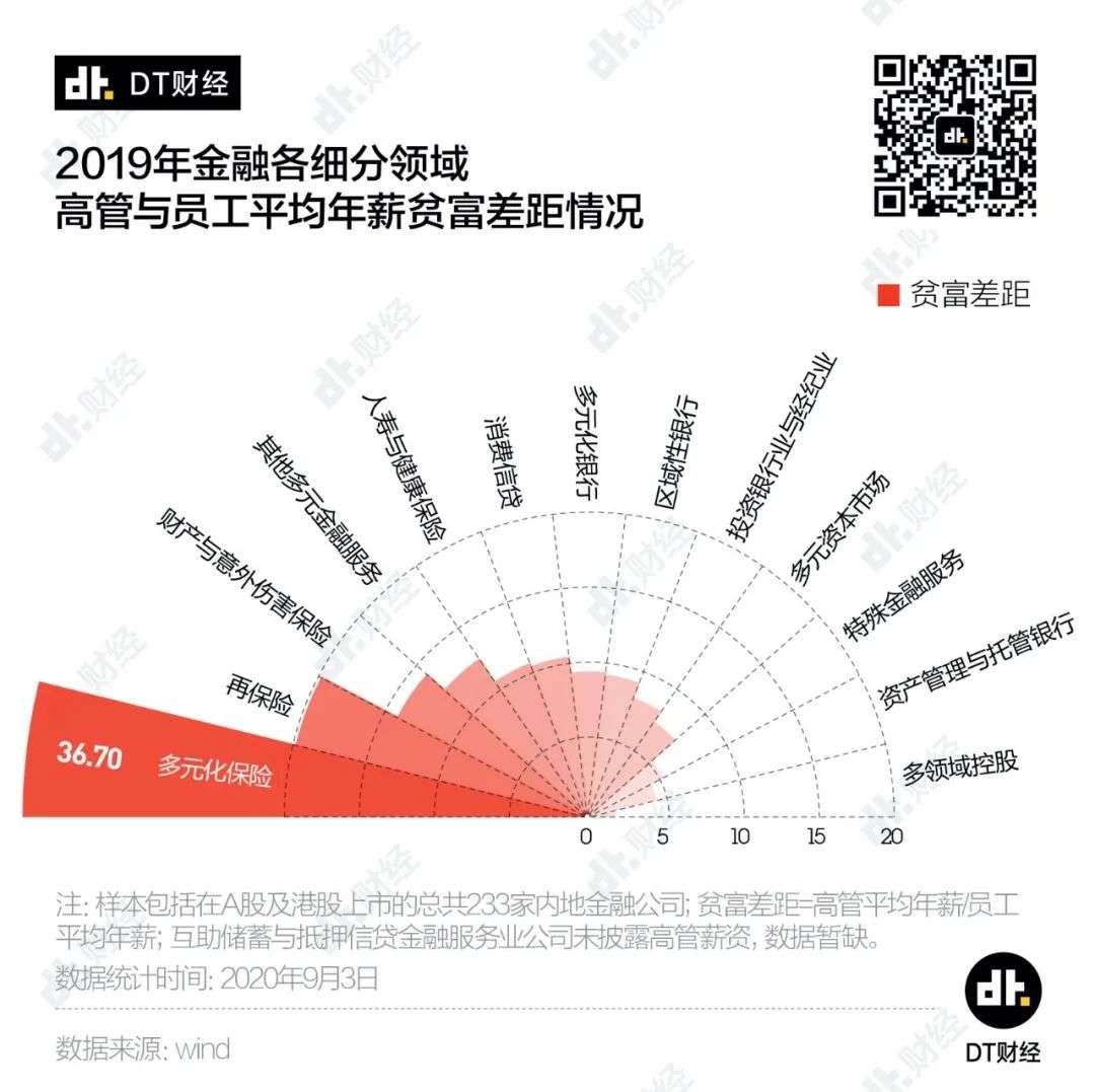 贫富差距的前四席被保险业囊括。其中,多元化保险一骑绝尘,贫富差距达到了将近37倍。除此之外,大多数金融细分领域的贫富差距不到10倍,资产管理与托管银行和多领域控股不到5倍。