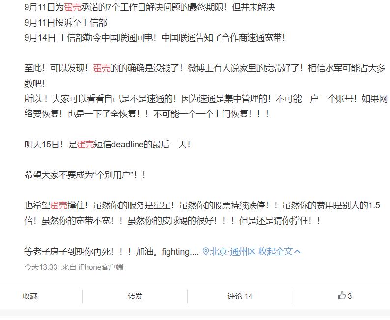 而断网的原因,是蛋壳对运营商违约,导致运营商中断了租客的宽带服务。有租户猜测,是蛋壳没钱导致“欠费”了。
