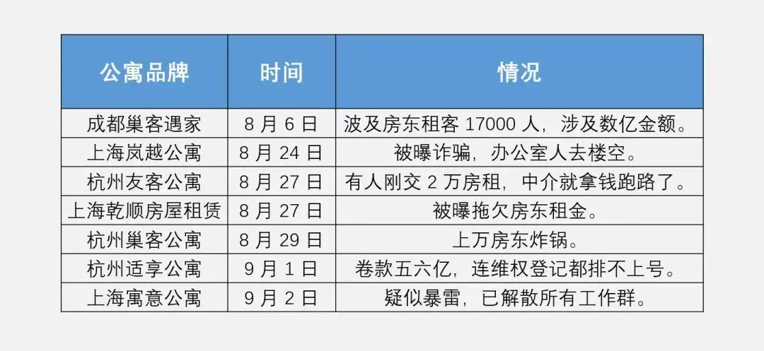 有媒体统计,今年8-9月,已经有7家长租公寓爆雷,其中6家更是集中在8月底到9月初的10天内。