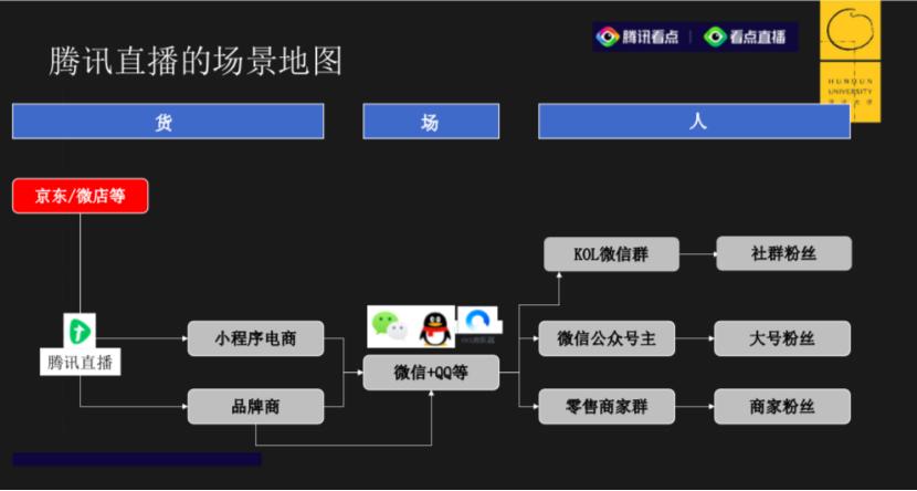 在“场”这一层面,腾讯已经搭建好了一个微信侧的直播场景,可以在小程序里面直接形成闭环交易,另外,我们还延展了除微信外腾讯的“场”,比如QQ、QQ浏览器、微视……实现了从私腾讯和公腾讯到混合域的过程,这也是“场景”搭建的过程。