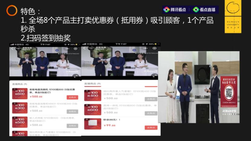 而且,老板电器还有直播一个特色——他们不卖机器,只卖优惠券。这是因为机器的价格都很高,对很多人来说都有较大的压力,而且机器也不见得那么着急需要。但是,消费者都有占便宜的心理,优惠券100元可抵500元,甚至1000元,这对那些有需求的人来说就是福利,而且这个需求没有很强的时限压力,你在一年内转化就可以。如果你买完之后发现又用不着了也没关系,可以退掉,不会有任何损失。这个优惠券的设计就引发了用户想占便宜的意愿,可以在直播间中快速转化。