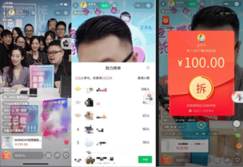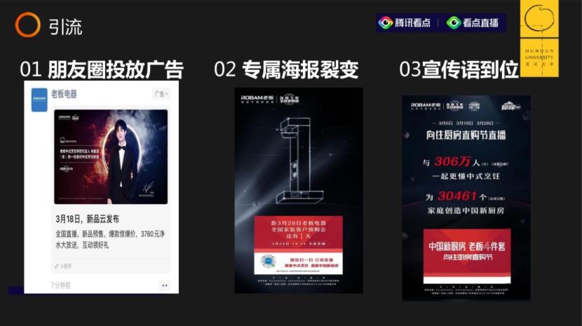 首先,他们通过朋友圈来投放广告;其次,做一些个人的专属海报进行分销裂变,只要用户进入你的直播间就会有一些激励,而这种激励会形成一个很好的进直播间的转化效果;最后是做宣传。