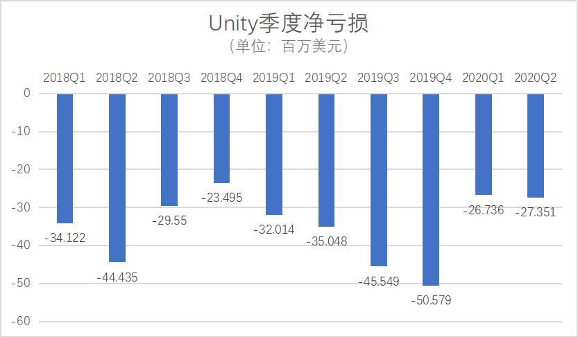 不过,Unity尚未实现盈利。招股书显示,2019年,Unity净亏损1.632亿美元,较2018年同期1.32亿美元的亏损额扩大24%;2020年上半年,净亏损5409万美元,较2019年同期6706万美元的亏损额收窄19%。