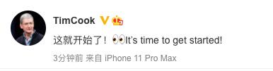 临近凌晨 1:00,库克在新浪微博上发布一则消息:“这就开始了!It's time to get started!”随后,在苹果官方网站与微信公众号的入口内,苹果秋季发布会正式开始。(此前公布的腾讯视频、微博、爱奇艺、B 站等合作入口均取消直播)