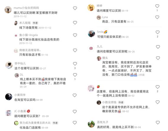 除此之外,大众洗护发品牌推出高端系列,有时是为渠道“服务”。以飘柔的“法式小香瓶”为例,为CS渠道而生,让这款产品杜绝了和线上消费者接触的可能性,飘柔显然不想让“9块9”的刻板印象去影响新生代的消费人群。在小红书上有不少博主“种草”飘柔“法式小香瓶”,但评论区最多的疑问就是“哪里可以买?”“为什么淘宝没有?”