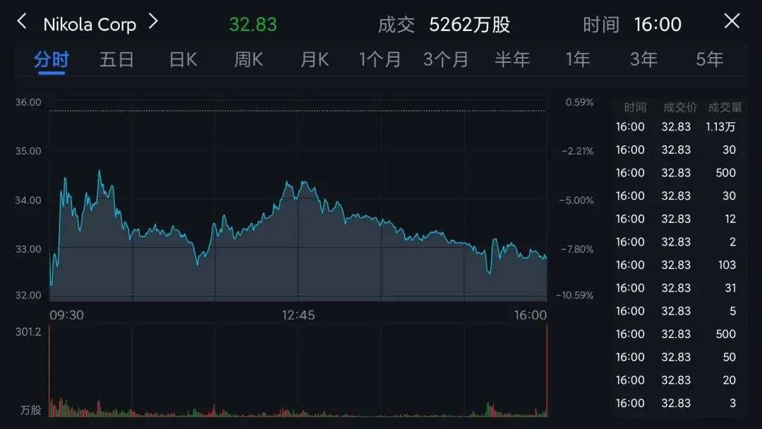 受此影响,昨日开盘后尼古拉的股价大跌9.42%,之后有所回升,收盘时该公司的股价仍下跌了8.27%,为32.83美元/股左右(约合人民币222.6元/股)。