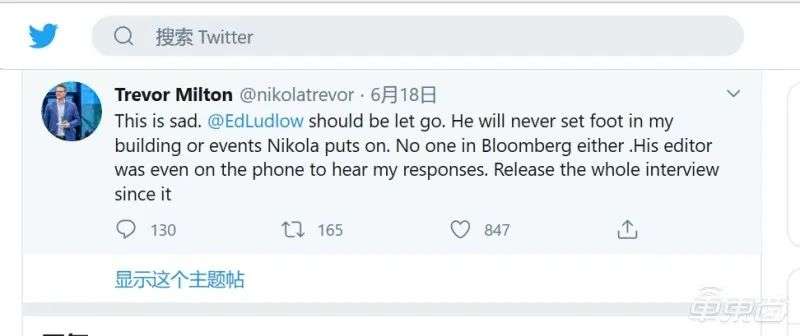 米尔顿还曾在2019年10月下旬在推特上称尼古拉收购了一家研究高密度电池的公司,并称该公司研究出了高能量密度电池。