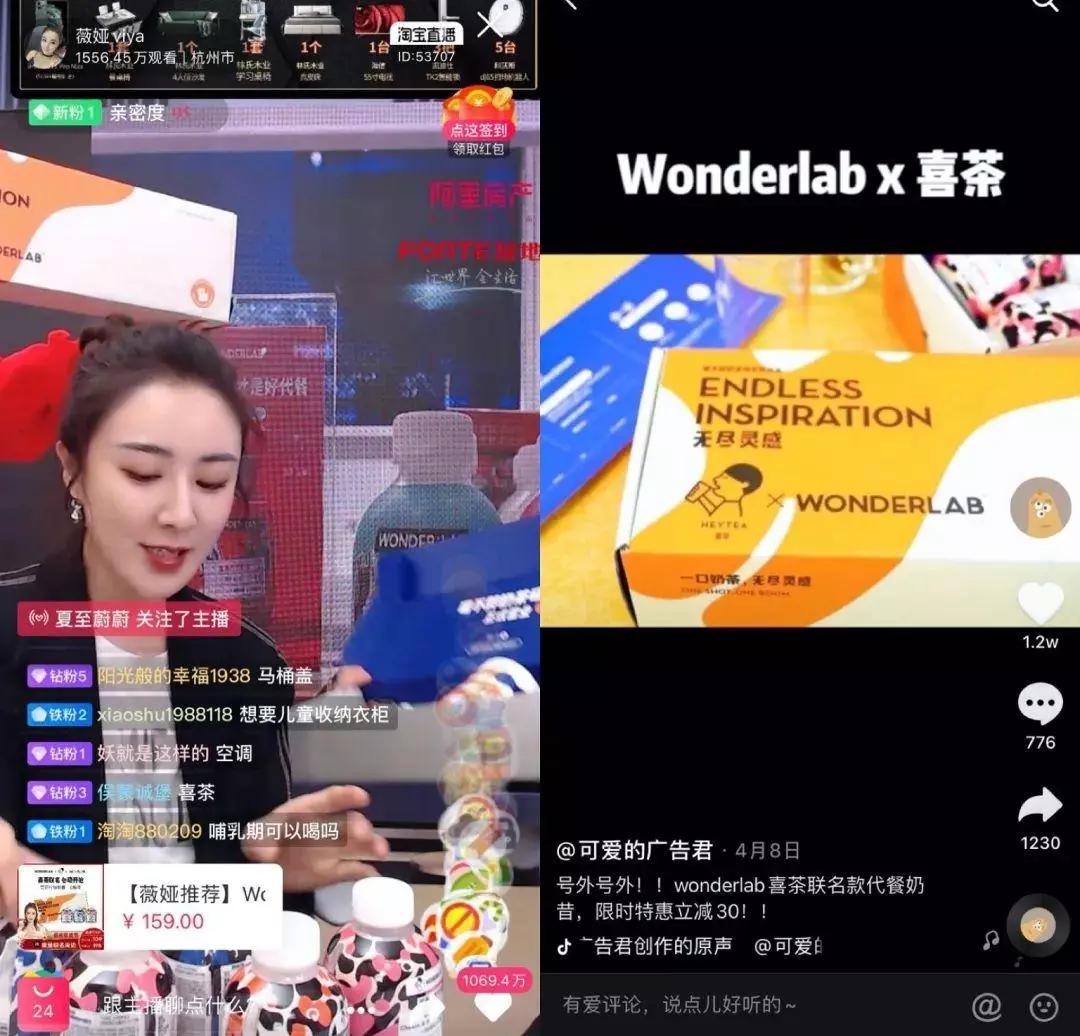 除此之外,WonderLab还与喜茶联名合作,在薇娅的直播间露脸, 随后在抖音、小红书、微博形成刷屏。