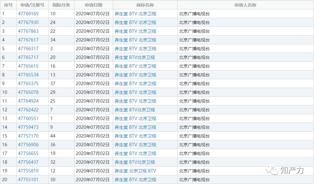 但笔者在中国商标网查询发现,北京电视台(含北京广播电视台,下同)此前从未申请注册过“养生堂”商标,直到2020年7月(对,你没看错,就是今年),才似乎“后知后觉”地申请注册了第一批共43件“养生堂BTV北京卫视”商标。目前这些商标还处于审查阶段。