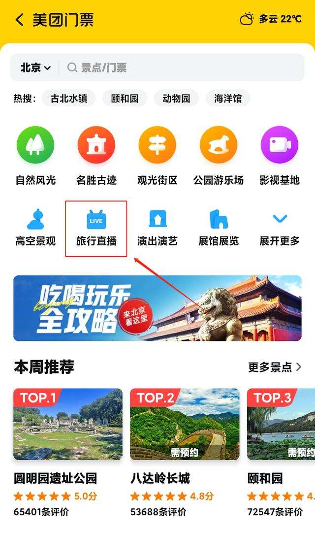 虽在目前还处在落后阶段,但美团已经在自身的三大本地生活平台中均进行了直播化尝试。在大众点评主页上设置了直播的入口,美团APP中则在景点门票入口内设置了“旅行直播”,美团外卖APP中则会定期的进行小程序直播。