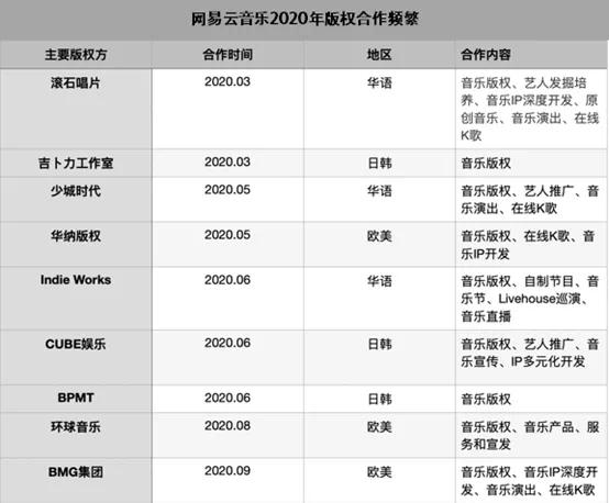 梳理网易云音乐今年来在版权合作上的动作:近半年来,网易云音乐先后与吉卜力、华纳版权、少城时代、滚石唱片、 环球音乐集团、Indie Works、BPMT(BPM Tokyo)、CUBE娱乐等达成合作,几乎每个月都有一至两笔版权合作达成。