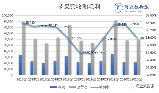 从苹果2017~2019年的财报来看,服务业务毛利率也在不断上升的,产品业务毛利率也稳定在34%左右,服务营收稳定增长。