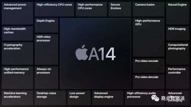 此次发布的A14芯片是首款采用5nm工艺打造移动设备芯片,晶体管数量相较7nm芯片增加了近40%,该芯片采用6核CPU设计,性能提升40%,并采用全新GPU构架,性能提升30%。另外,其CPU采用了第二代机器学习技术,每秒可执行11万亿次运算,较上一代提升两倍。