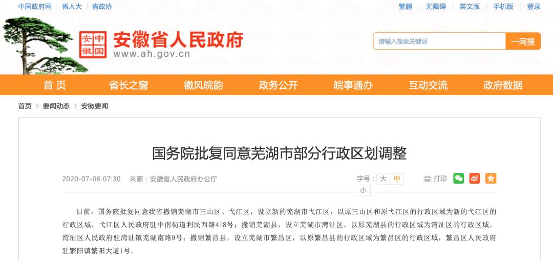 2020年7月,芜湖再度进行区划调整