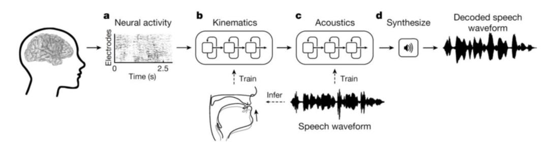图:加州大学旧金山分校科研团队通过解码发音器官的运动相关的脑电波进行语音合成。来源 https://doi.org/10.1038/s41586-019-1119-1